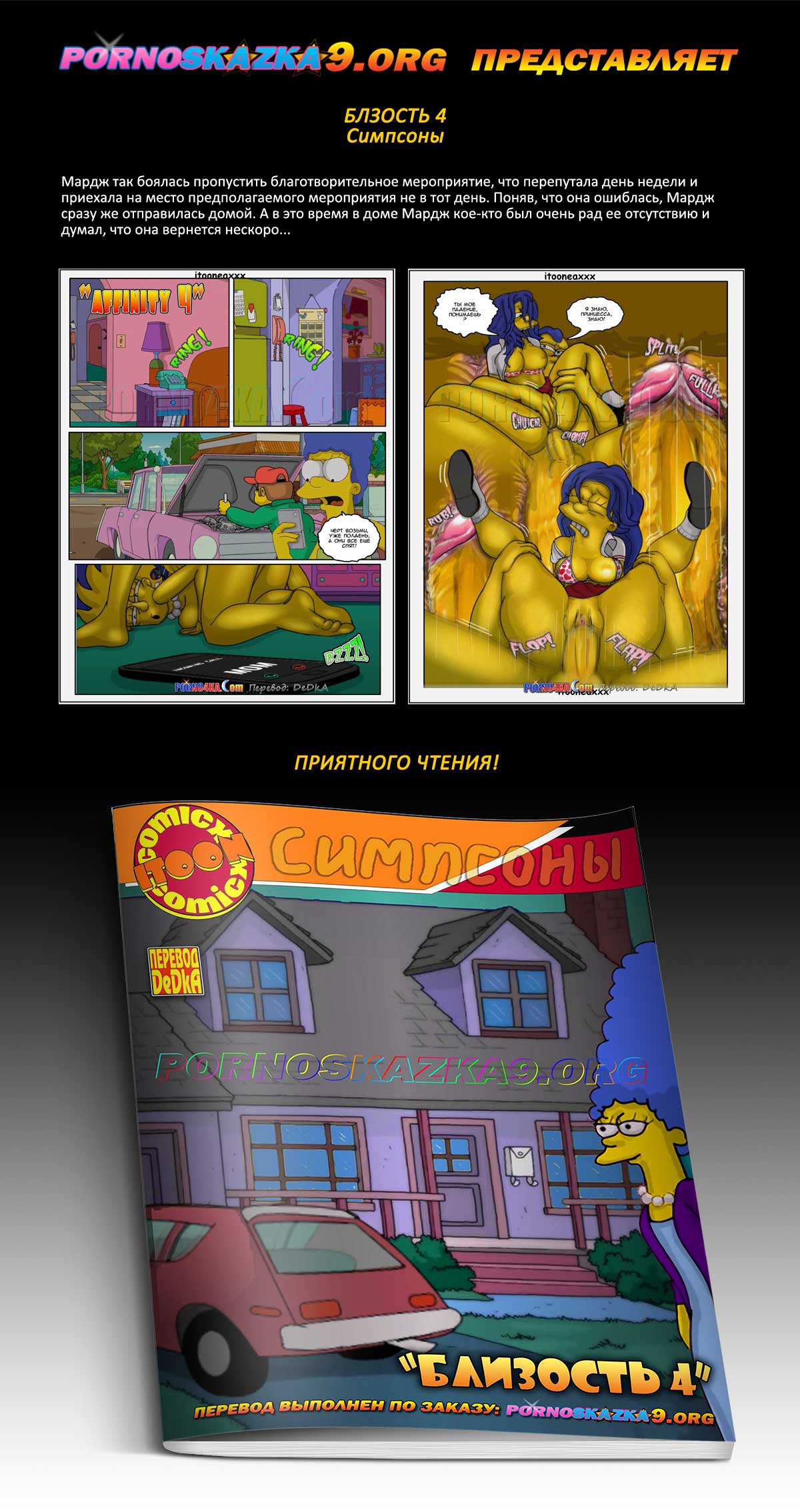 Порно комикс «Близость. Часть 4: Симпсоны.» Мардж так боялась пропустить благотворительное мероприятие, что перепутала день недели и приехала на место предполагаемого мероприятия не в тот день. Поняв, что она ошиблась, Мардж сразу же отправилась домой. А в это время в доме Мардж кое-кто был очень рад ее отсутствию и думал, что она вернется нескоро…